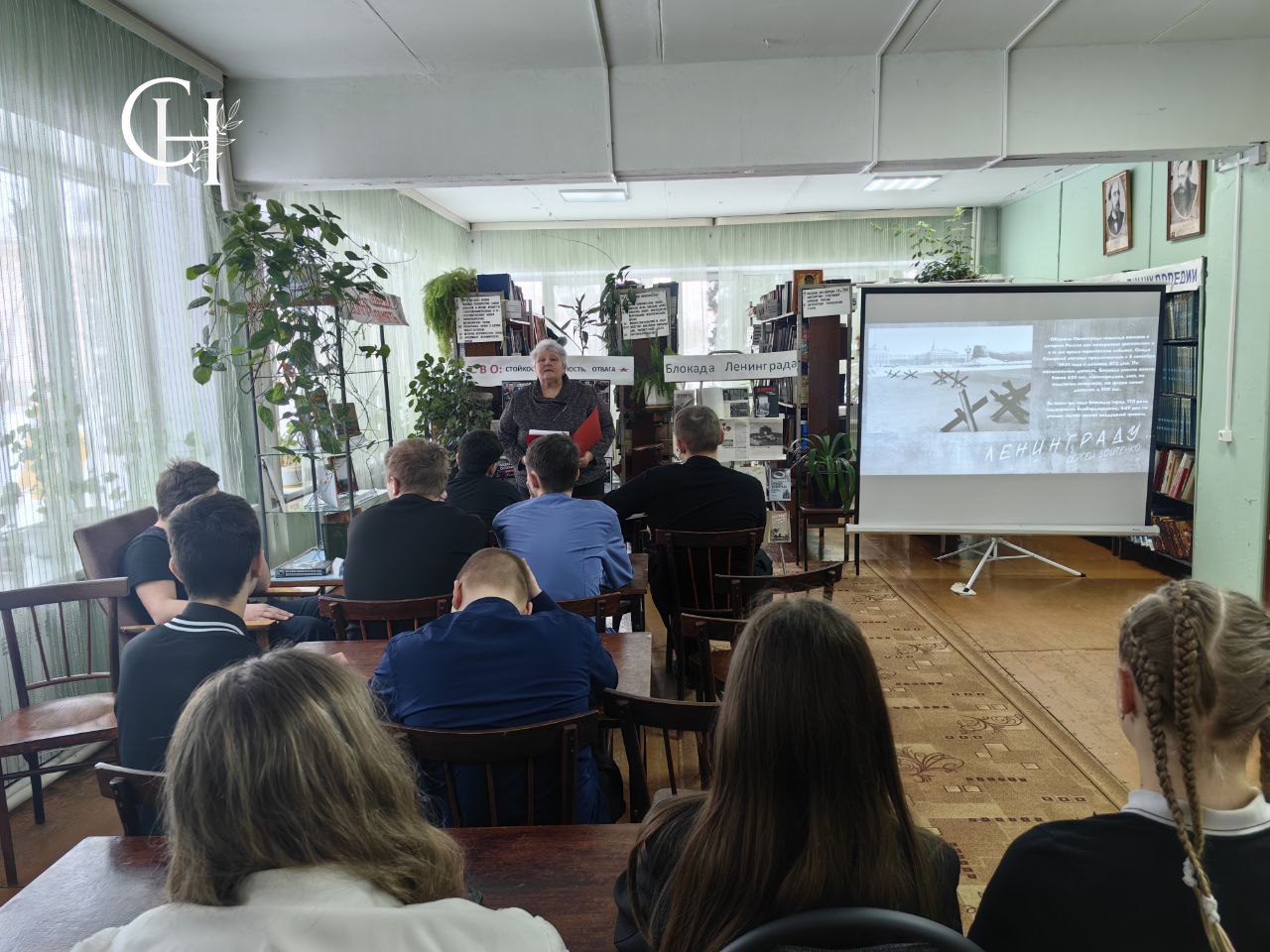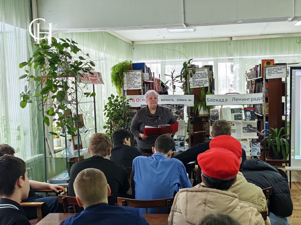Елена Васильевна предложила ребятам познакомиться с книжной выставкой «Блокадный Ленинград», и юнармейцы из числа школьников вслух выборочно прочитали из представленных на ней книг стихи и воспоминания блокадников.