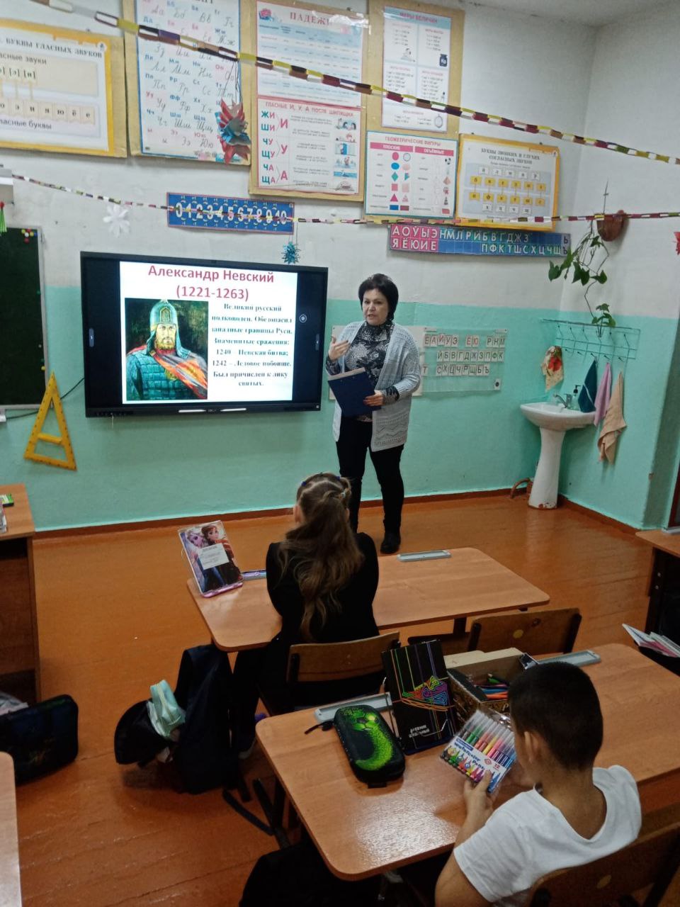 Ведущая Анжелика Новикова предварила внеклассный час обсуждением с детьми качеств настоящего героя. Вместе они пришли к выводу, что герой – это человек, совершивший мужественный, самоотверженный поступок, готовый в любой ситуации прийти на помощь, и даже пожертвовать собой ради блага Родины и других людей.