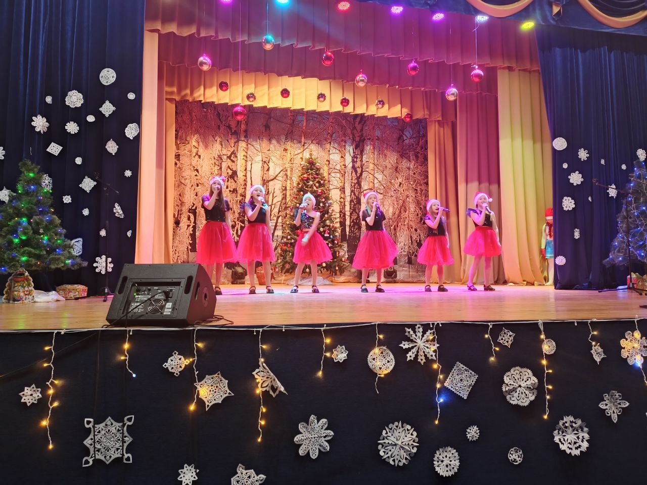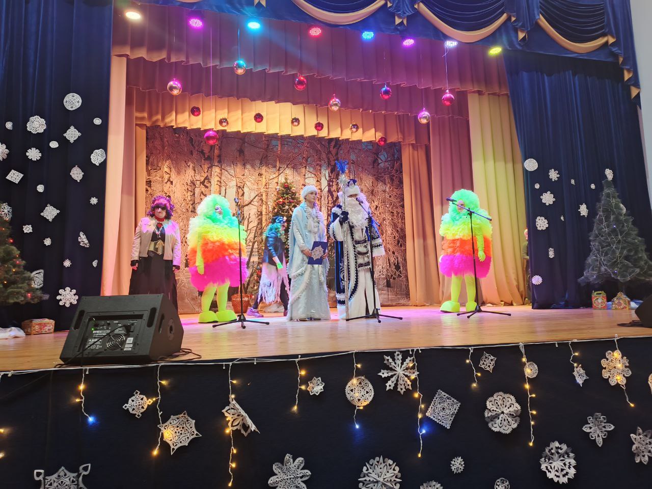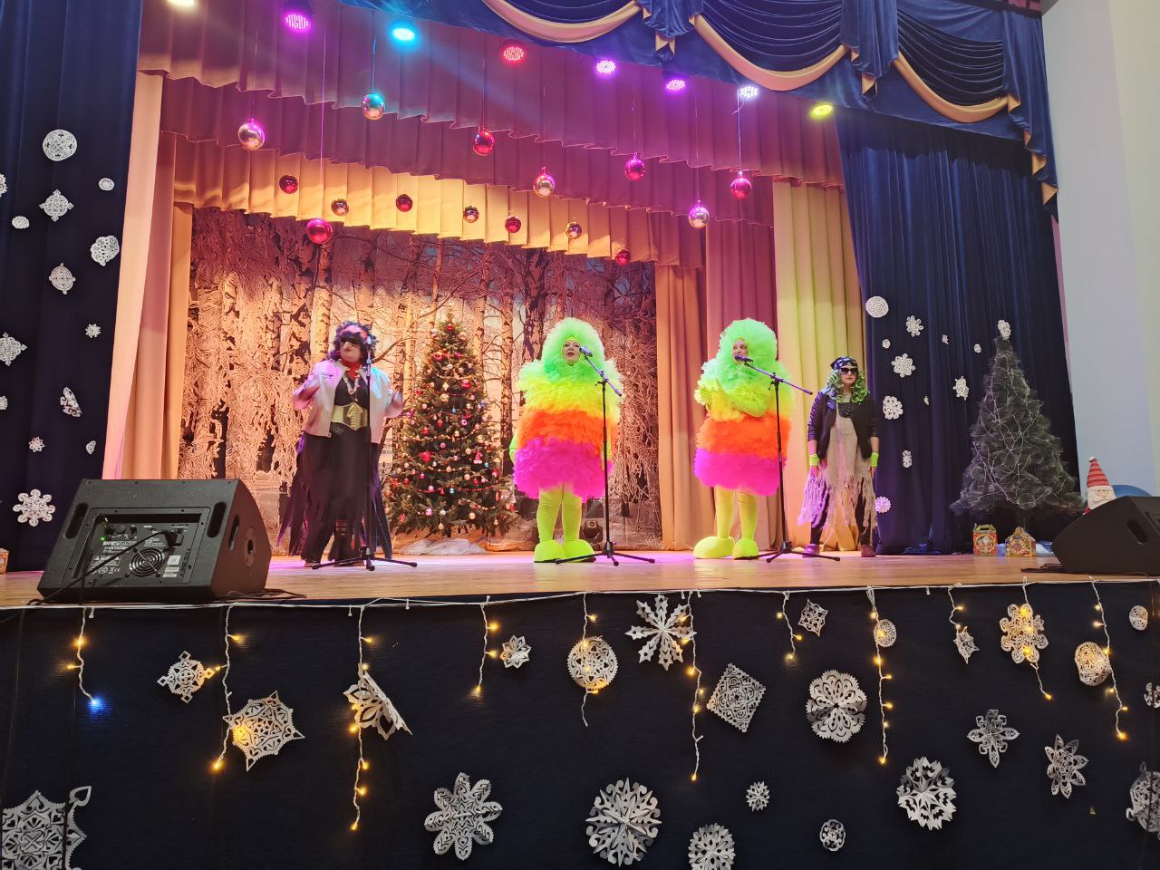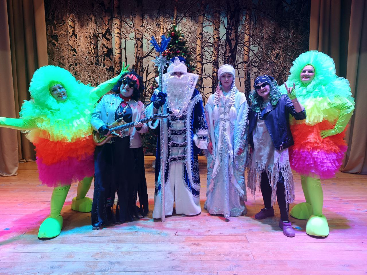 Затем сказочные персонажи: Баба-Яга рокерша, Кикимора, Дед Мороз и Снегурочка, ведущие эльфы Ириска и Барбариска пригласили юных гостей праздника в настоящую сказку и не давали никому скучать. Во время представления ребята с болшьшим энтузиазмом приняли участие в танцевальных и песенных флешмобах, а также немного поиграли.